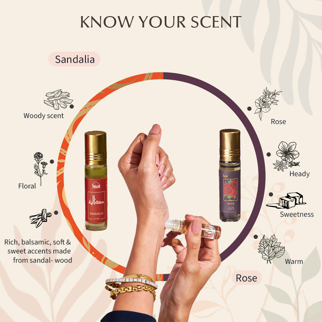 CONTENTS: 6ml Sandalia roll on attar oil and 6ml Rose roll-on unisex attar oil