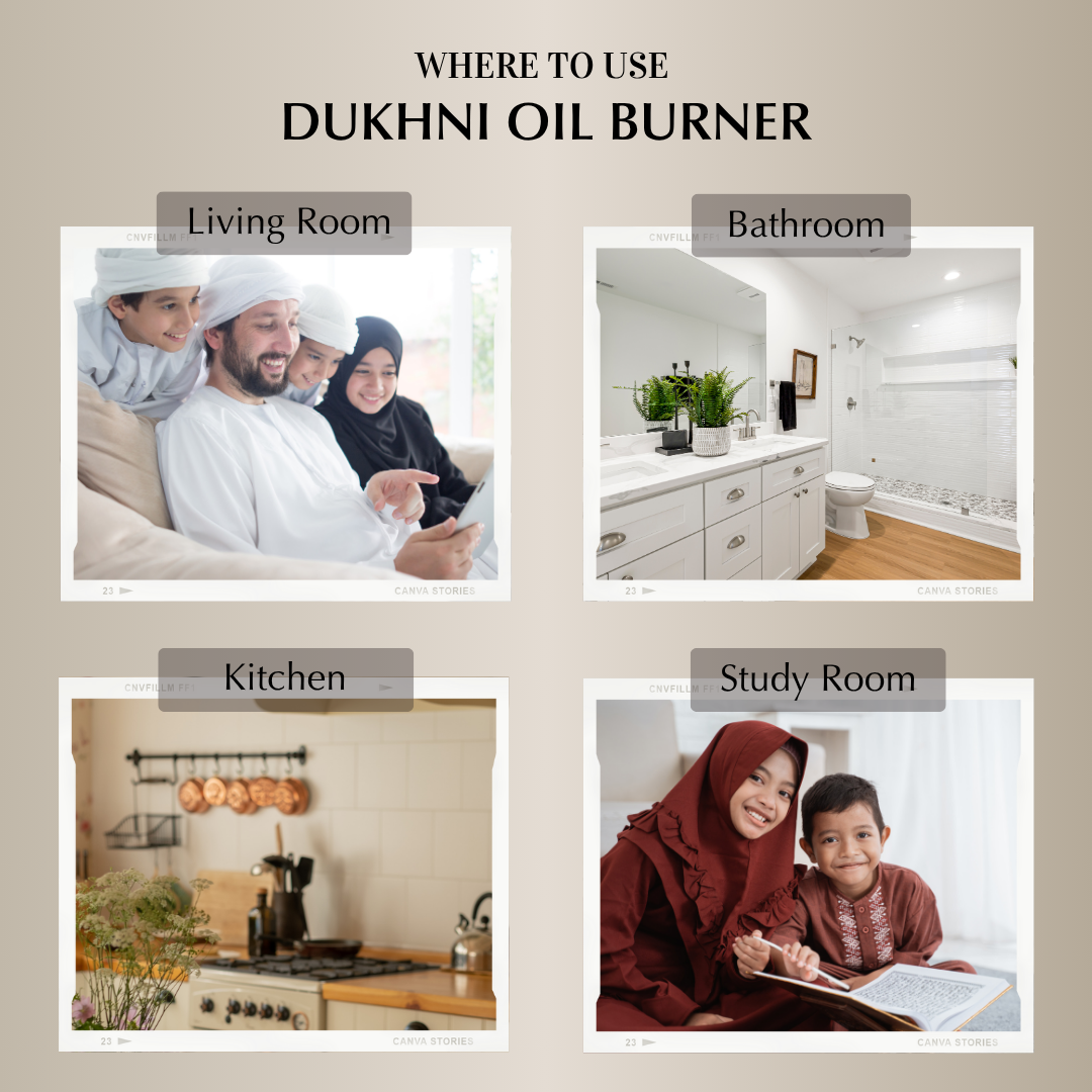 Where to use: Dukhni diffusers, oil burners are versatile and can be used with diffuser oils, essential oils and aroma oils to scent many different spaces. You can create a welcoming atmosphere in your home, maintain a pleasant aroma in your bathroom, enhance the ambiance in your office, or fragrance your store or office
