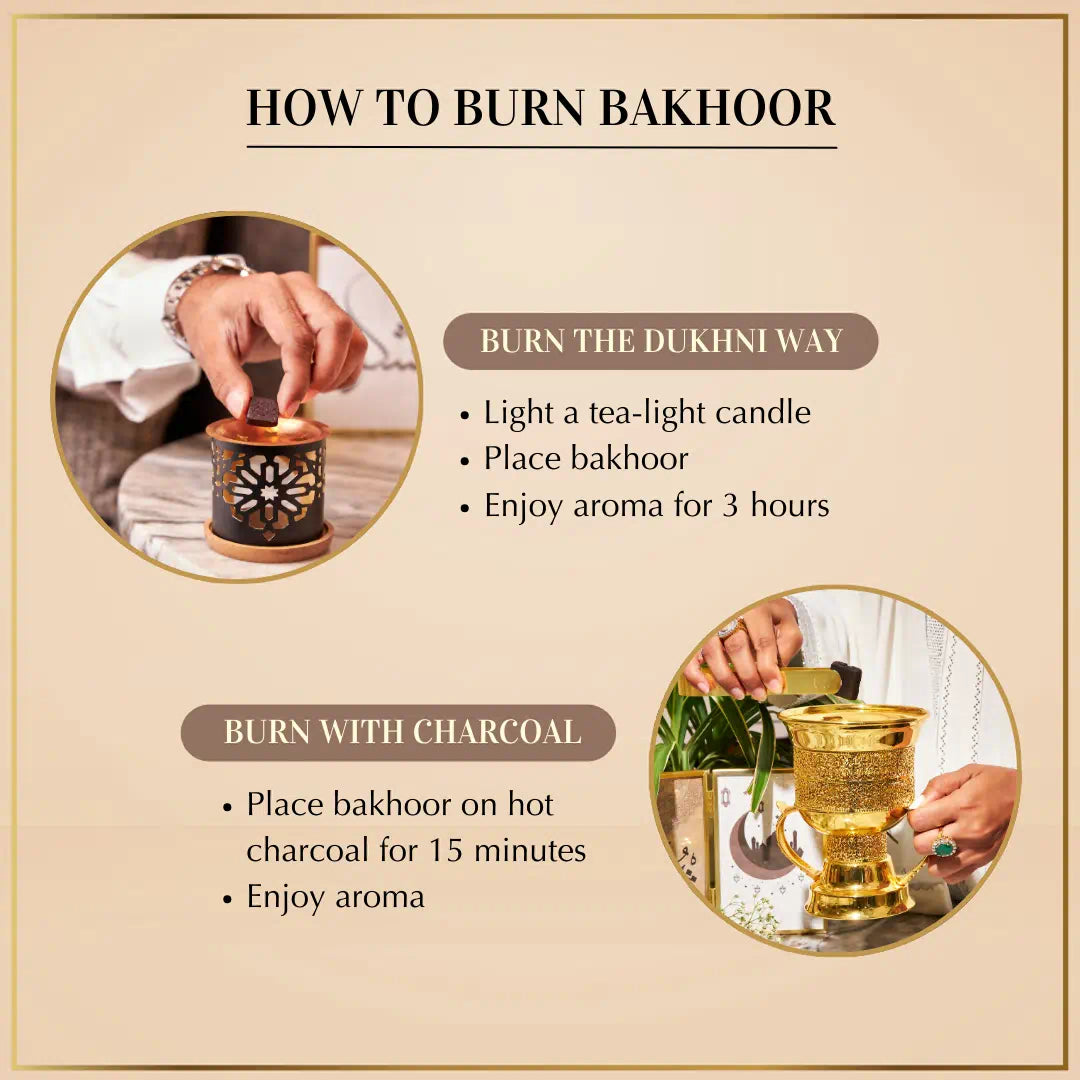 What's included? Dukhni Sandal Bakhoor tray with 9 pieces, and 1 extra sample piece.