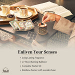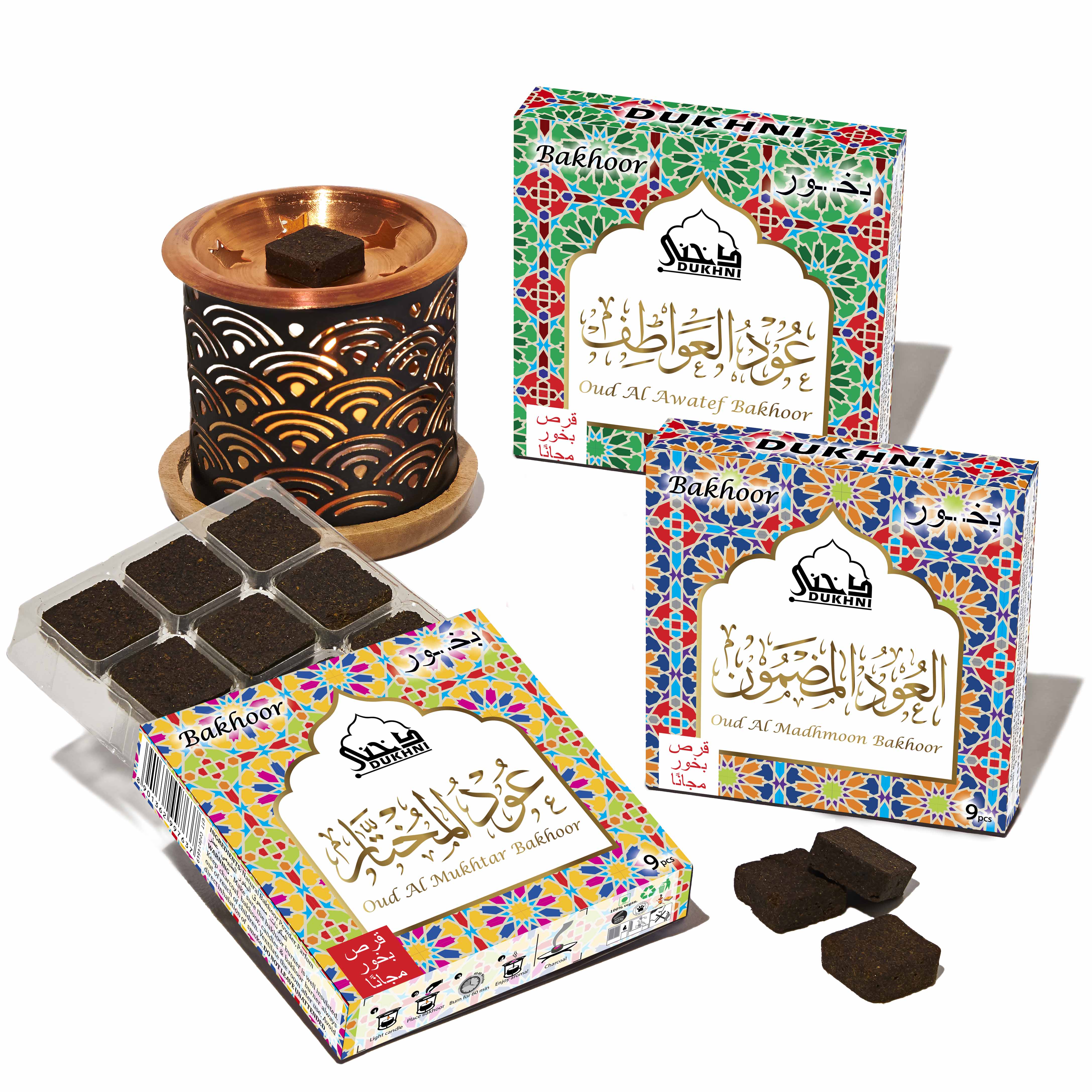What's included? 9 pieces each of 3 different fragrances - Oud Al Mukhtar, Oud Al Madhmoon, Oud Al Awatef with a smoke-free bakhoor burner and a tealight candle
