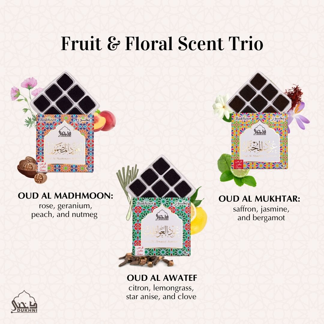 Scent profile: Oud Al Mukhtar is a luscious floral scent that opens with a harmonious blend of saffron, jasmine and bergamot followed by a rose and cedar heart. With top notes of rose and geranium followed by a juicy heart of peach and nutmeg, Oud Al Madhmoon is a fresh, fruity scent. Grassy hints of citron and lemongrass open up to a spicy middle of star anise, clove and stone flower with warm and elegant base notes in Oud Al Awatef