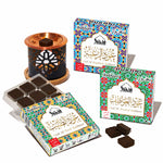 What's included? 9 pieces each of 3 different fragrances - Oud Al Teeb, Oud Al Raghbah, Oud Al Awatef and 3 extra sample pieces with a smoke-free bakhoor burner and a tealight candle.