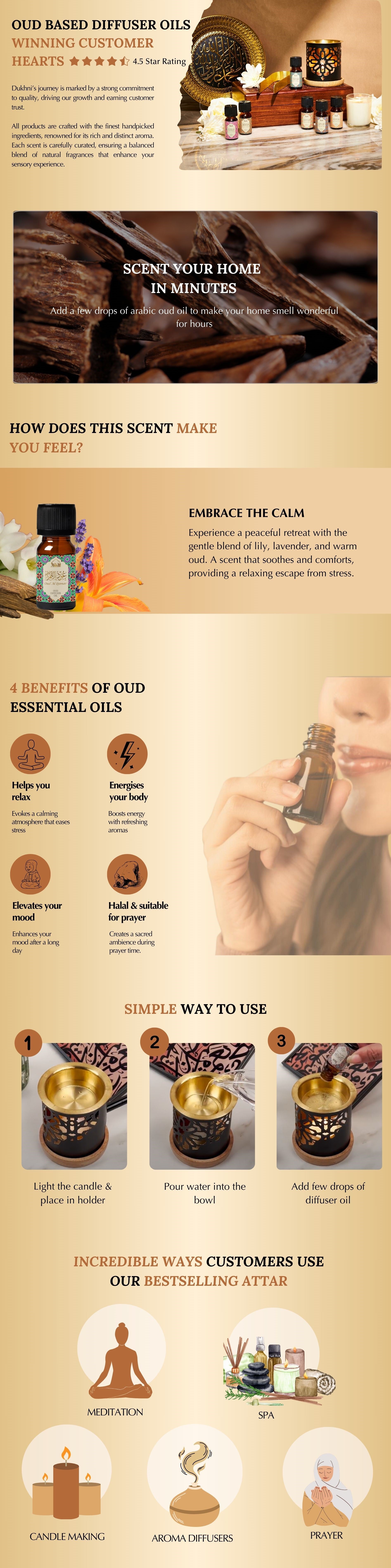 How to use: Add 8-10 drops of the oud oil to water and burn it using a candle based or electronic diffuser. You can add more oil to your diffuser for a stronger scent or if burning in a very large area