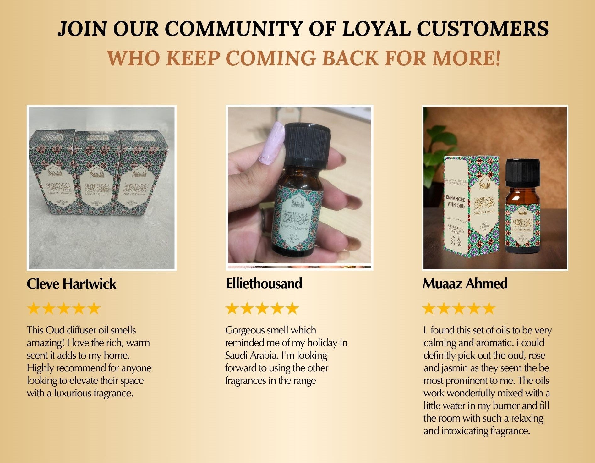 Experience luxury aromatherapy with our pure Oud diffuser oils. Add to a diffuser oil burner or a humidifier to create a serene, mosque-like atmosphere in your home—an amazing gift for any occasion.