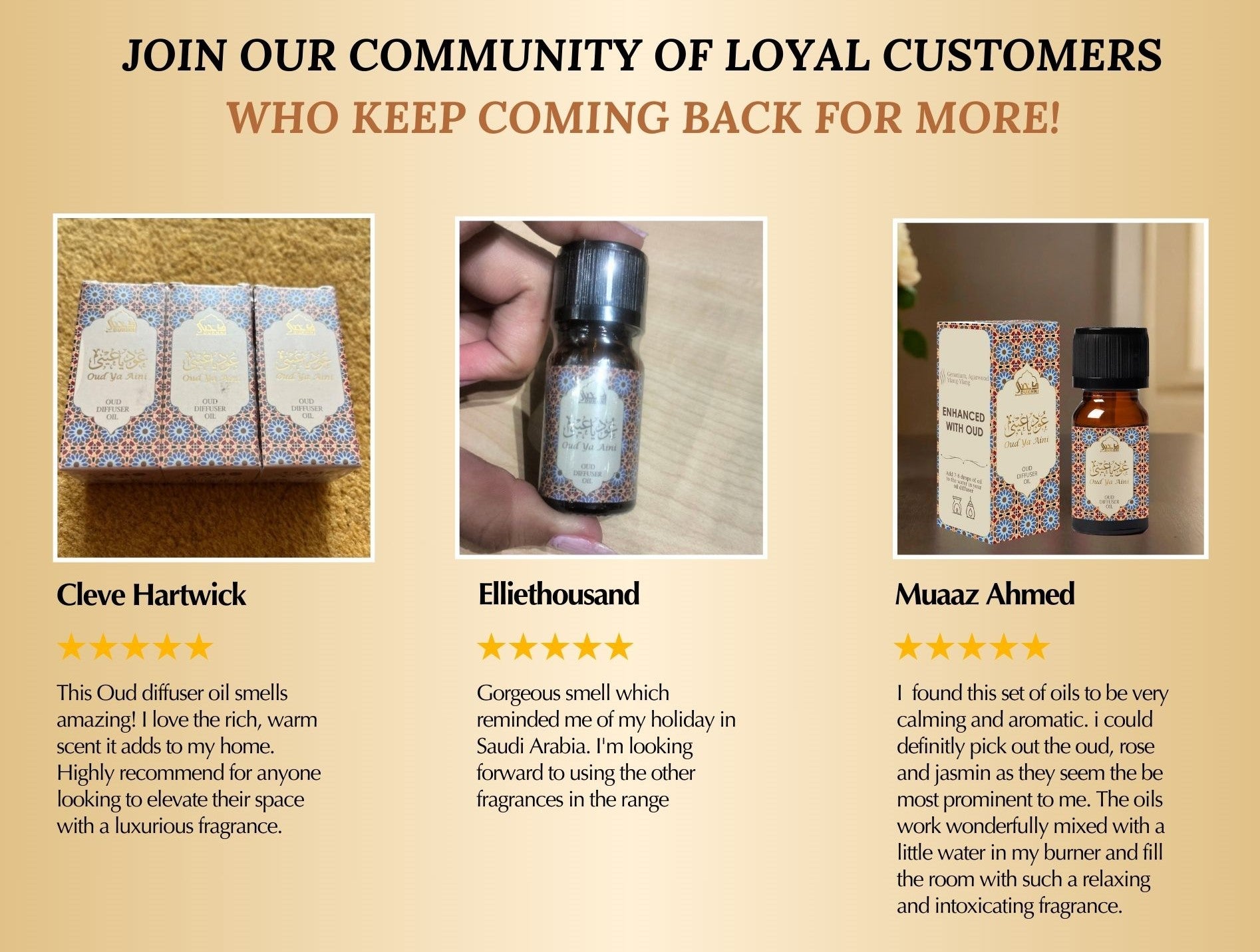 Experience luxury aromatherapy with our pure Oud diffuser oils. Add to a diffuser oil burner or a humidifier to create a serene, mosque-like atmosphere in your home—an amazing gift for any occasion.