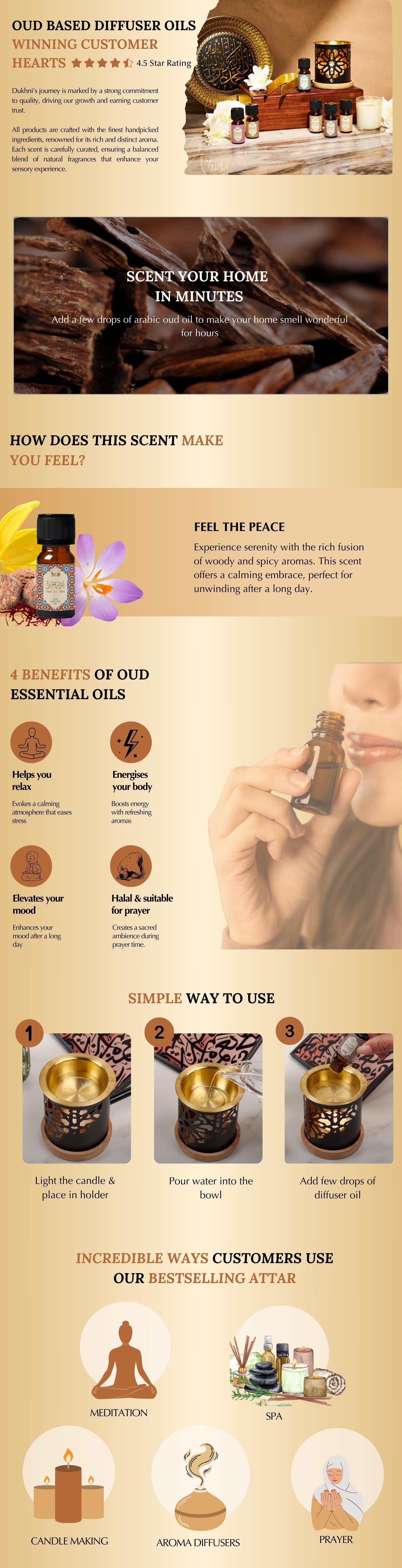 How to use: Add 8-10 drops of the oud oil to water and burn it using a candle based or electronic diffuser. You can add more oil to your diffuser for a stronger scent or if burning in a very large area
