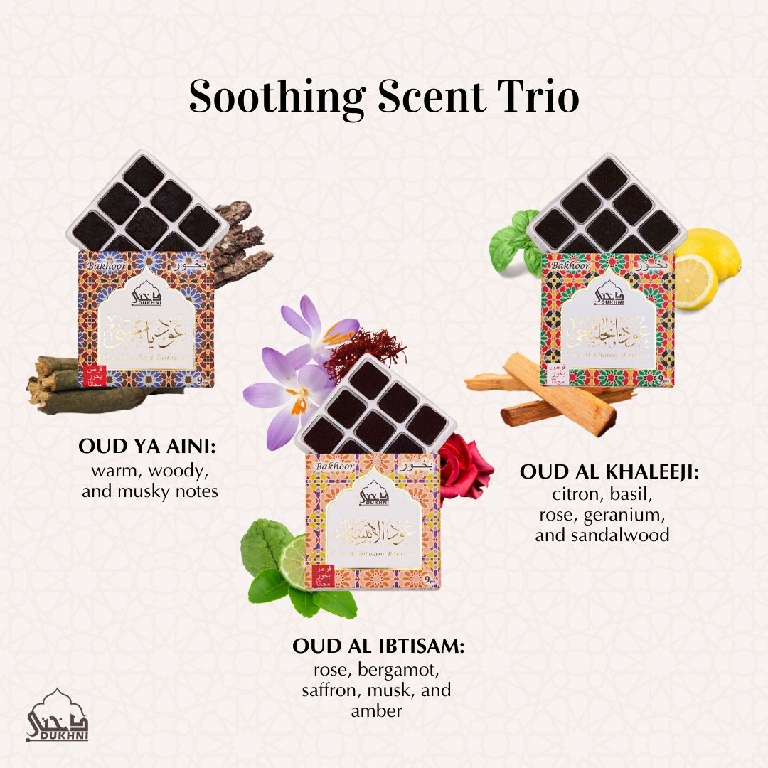 What's included? 9 pieces each of 3 unique fragrances - Oud Al Khaleeji, Oud Ya Aini & Oud Al Ibtisam, and 3 extra sample pieces. It comes with a smoke-free bakhoor burner