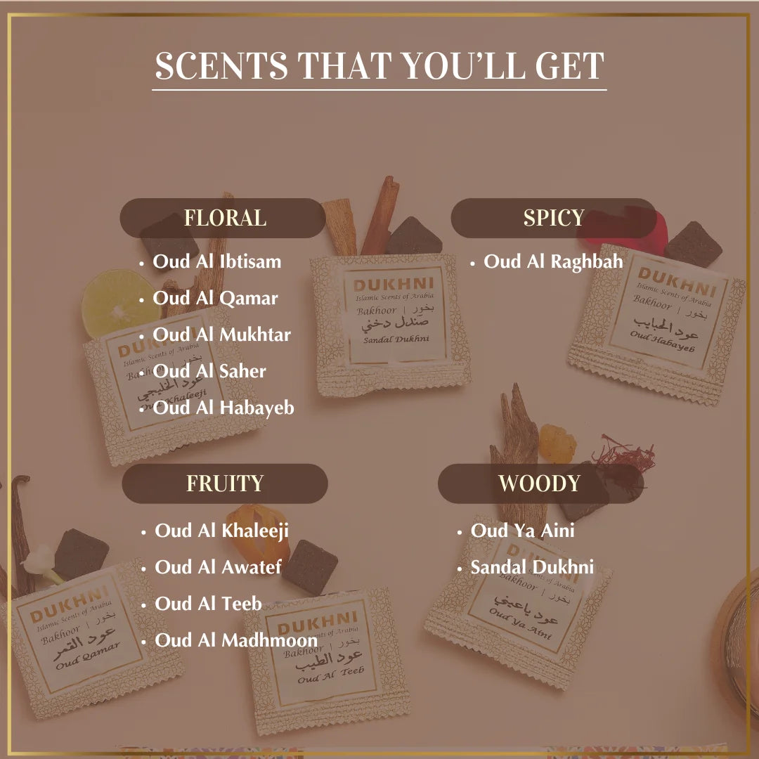 DUKHNI OUD BAKHOOR: The Variety Box is carefully curated to include a wide assortment of fragrances from sweet and floral to rich, deep and woody scents. A gift of discovery, our variety box is a great way for you to experience the range of Dukhni Bakhoor. Dukhni Bakhoor is ideal to light before prayer time, while reading the Quran, meditating, relaxing or after cleaning your home. It also works well to eliminate cooking smells