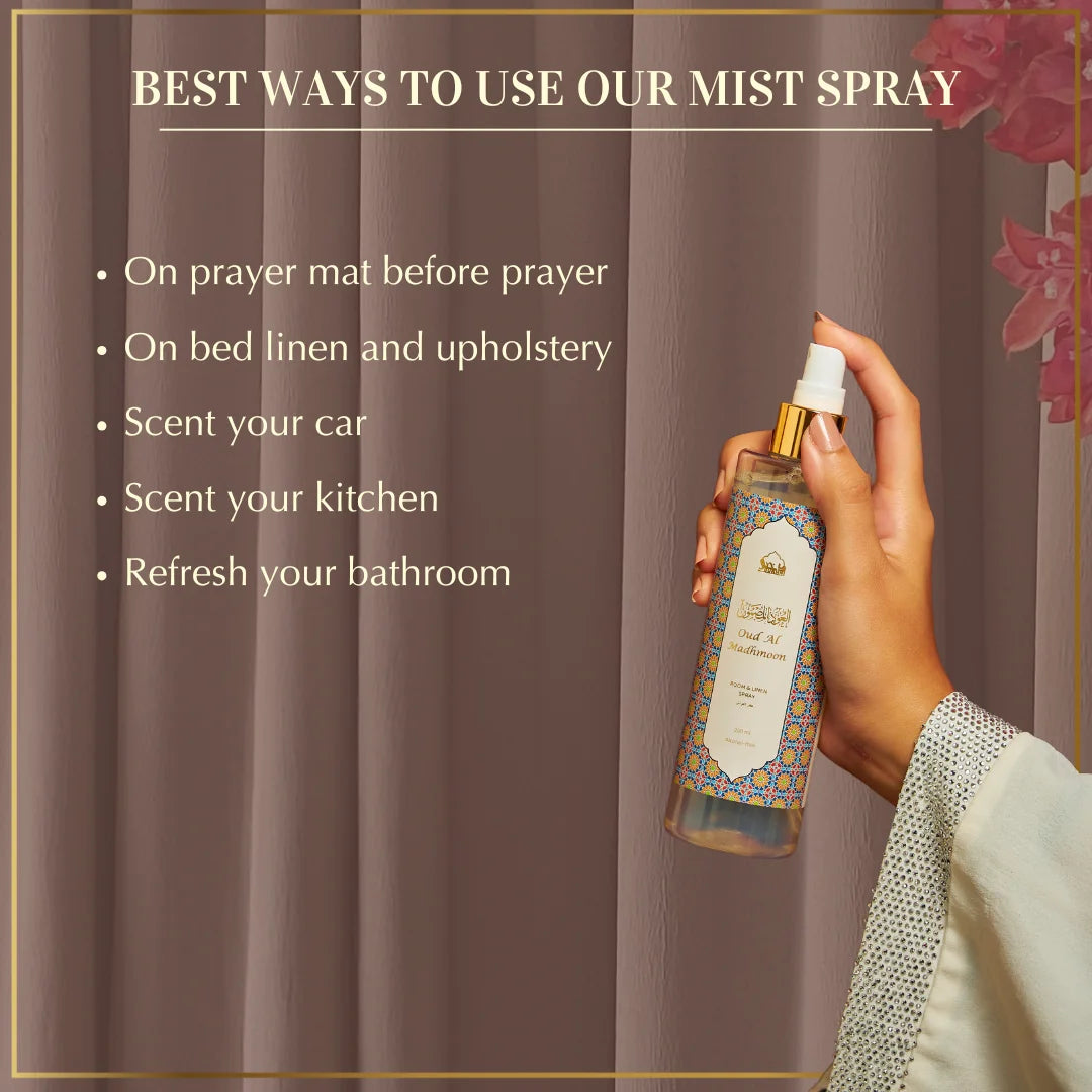 Madhmoon Attar al Faraash includes a 1 x 250ml bottle of non-alcoholic Natural Mist Spray