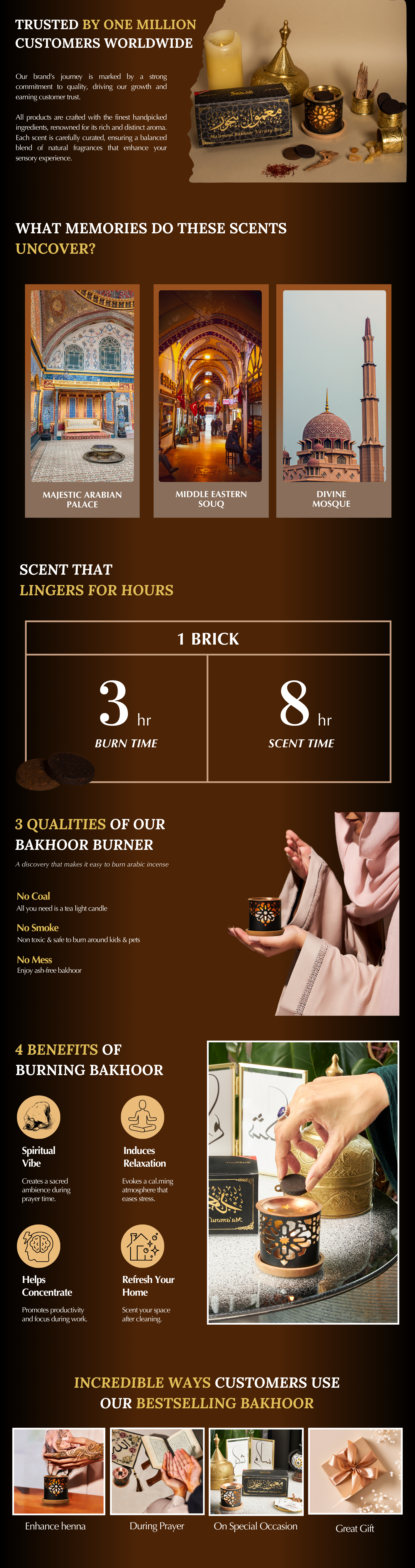 Cultivate calm in any space Ideal for prayer time, while reading the Quran, meditating, or simply relaxing. It also eliminates cooking smells, bathroom odors, and bad smoke. Perfect for special occasions and gatherings!