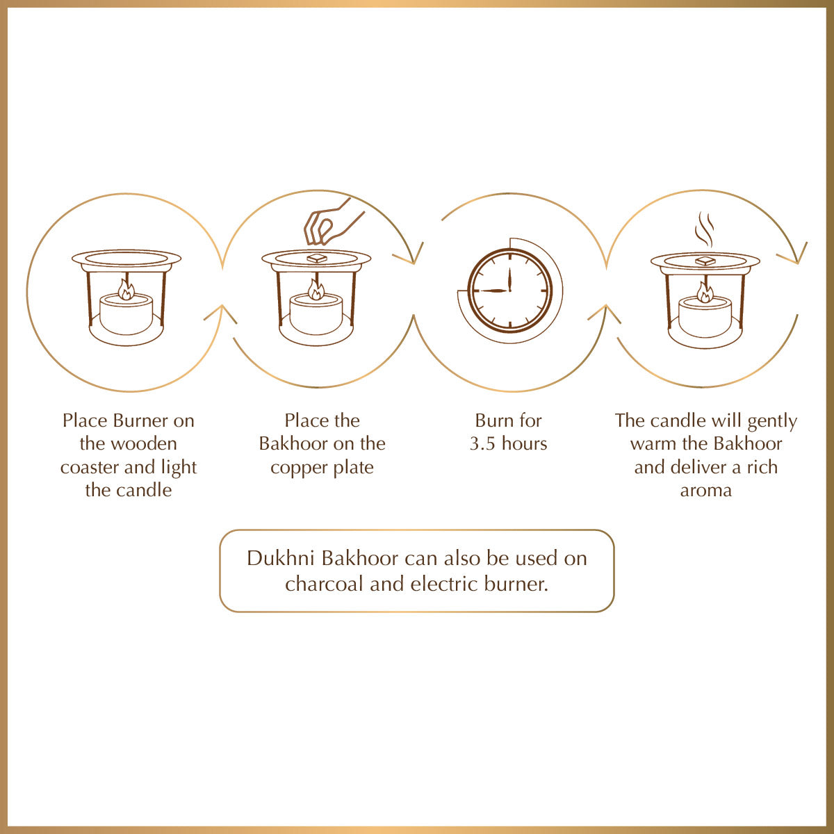 A single Dukhni bakhoor piece can be burner for upto 3.5 hours.