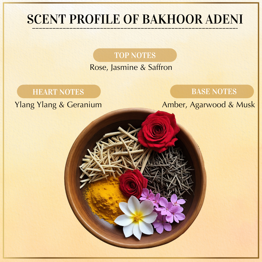 Adeni Bakhoor: Deep, rich Arabic fragrance reminiscent of the vibrant Souks of Arabia.