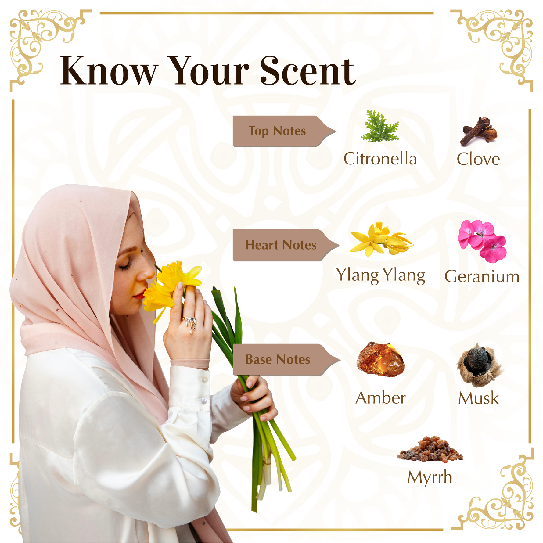 Spicy clove leads the fragrance, unfolding into an exotic, earthy blend of frankincense, myrrh, amber, and patchouli. This warm and balsamic aroma is deep, sophisticated, and enveloping, creating a serene and luxurious sensory experience.