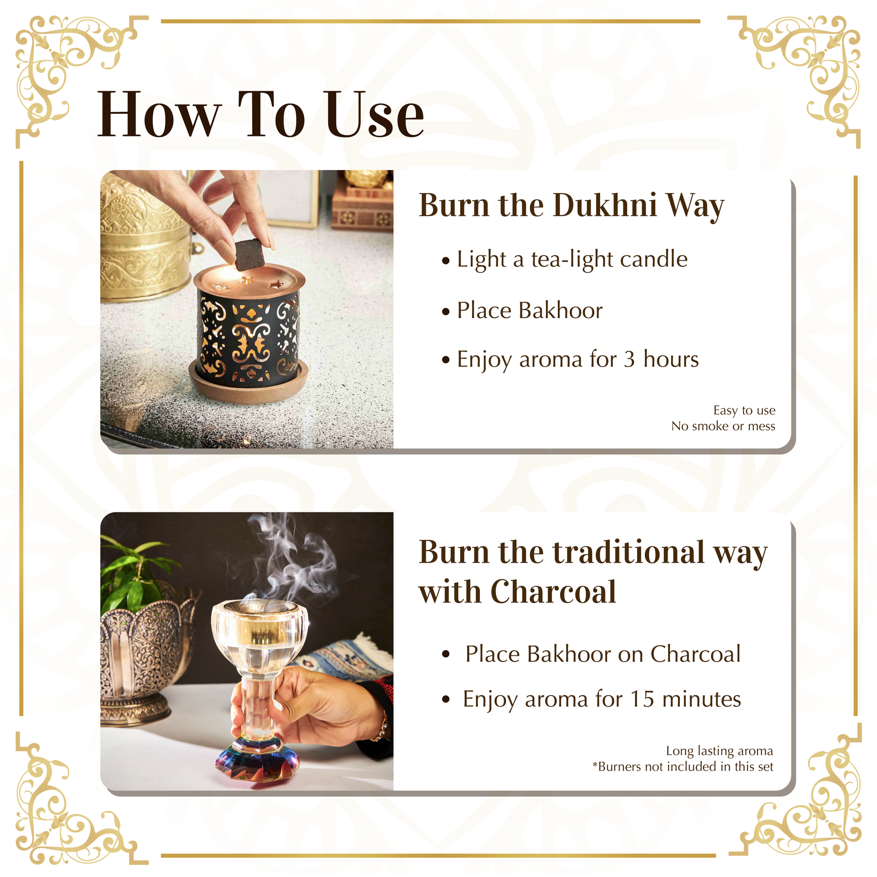 Place a bakhoor piece on a heated charcoal disc, electric burner, or Dukhni candle burner. Allow the aroma to gently diffuse, filling your space with luxurious fragrance. Use daily or for special occasions to create a serene, welcoming environment.