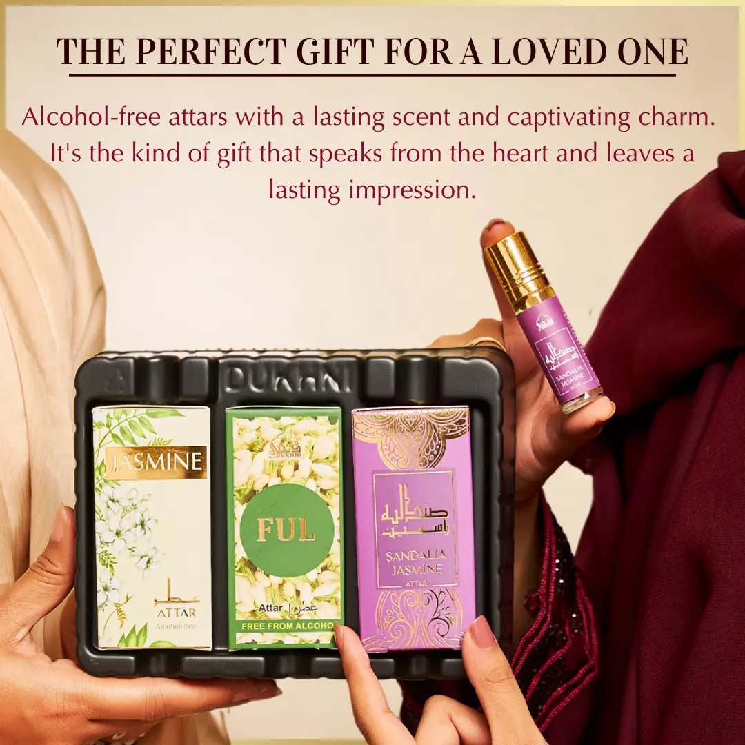 This 3-piece attar set features three 6ml bottles of luxurious, alcohol-free perfume oils—Jasmine, Attar Ful, and Sandalia Jasmine. With its uplifting floral theme and elegant packaging, it makes a beautiful gift set for anyone who adores fresh, calming jasmine scents.