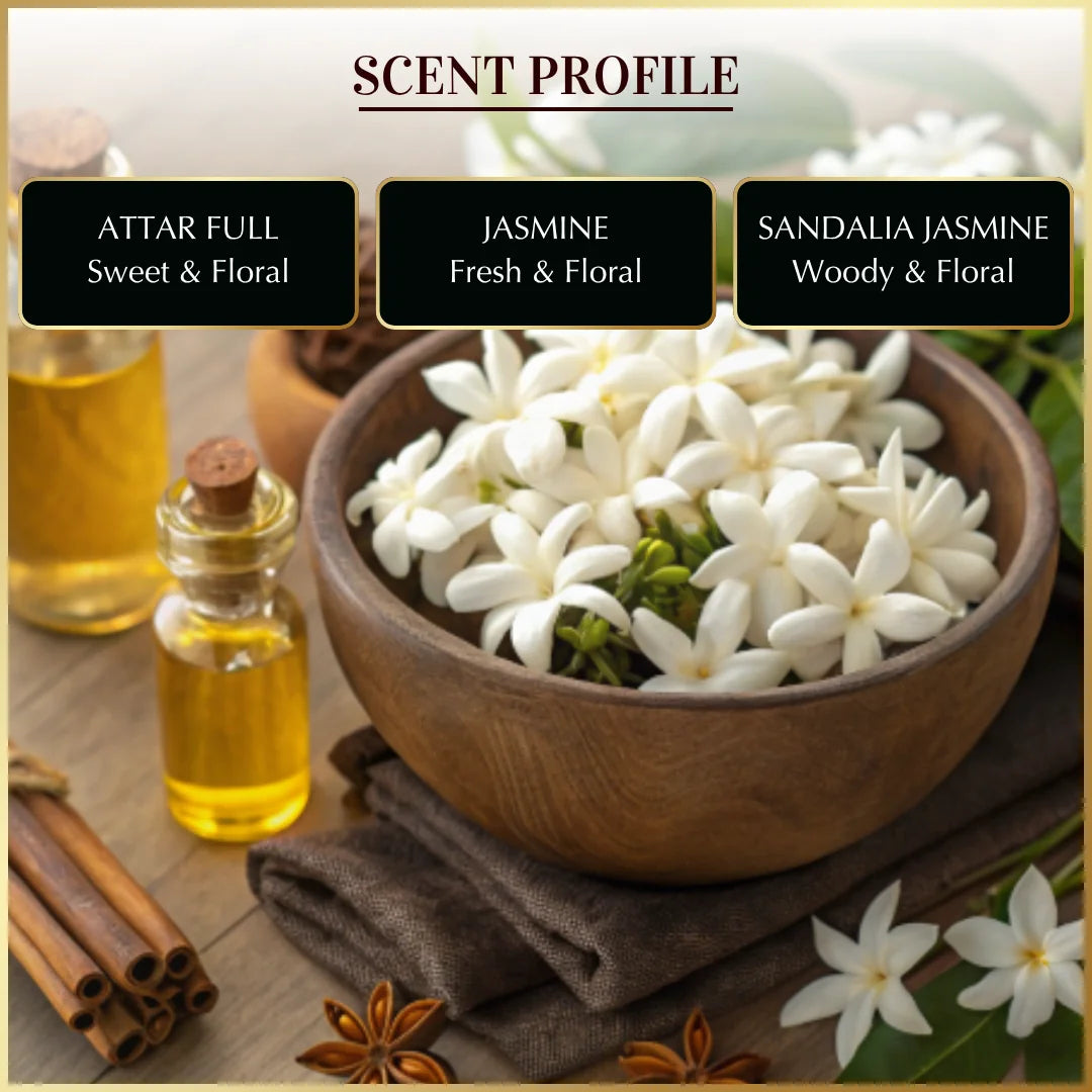Sandalia Jasmine: Jasmine enriched with creamy sandalwood, creating a musky, woody scent that’s smooth, comforting, and perfect for everyday wear.