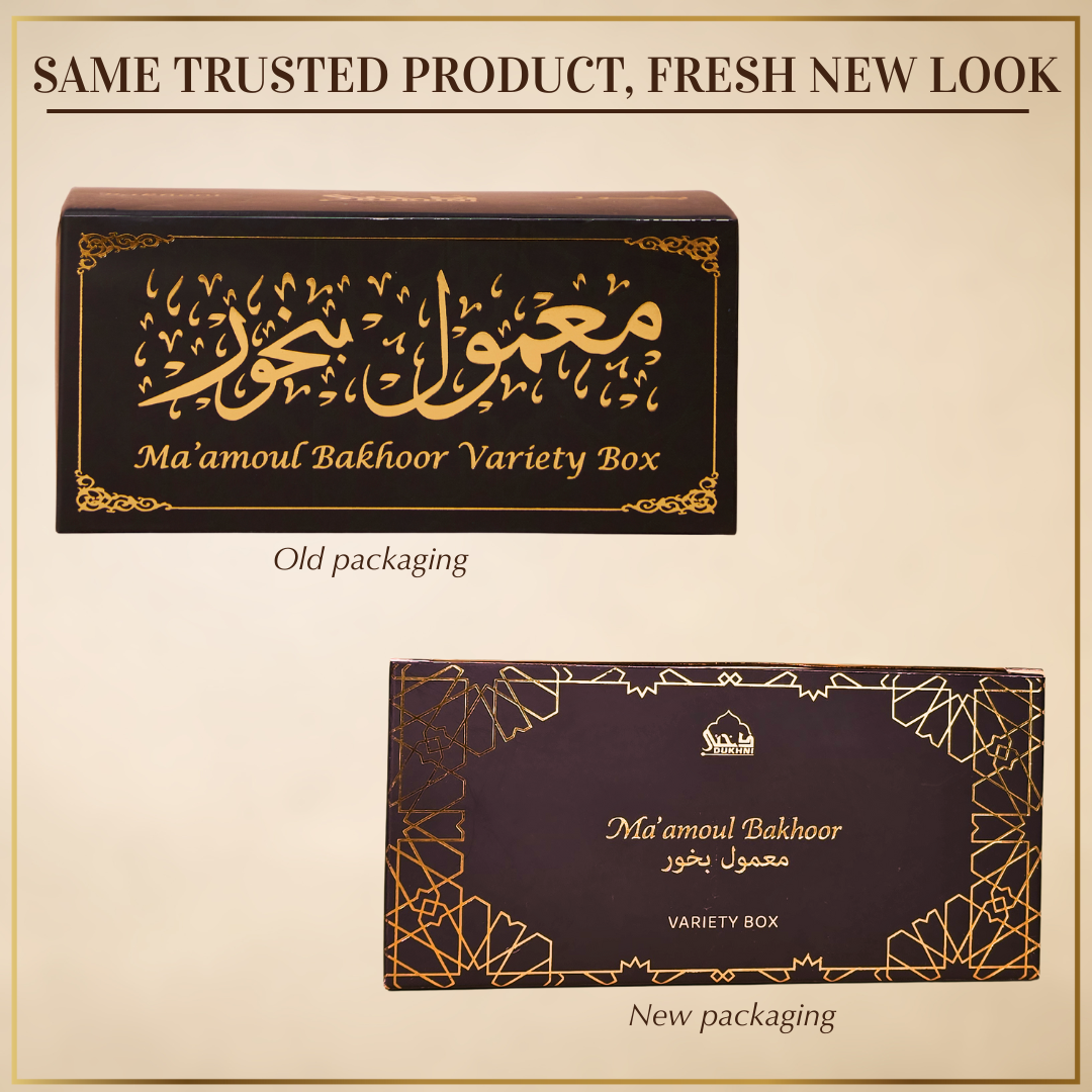 The Dukhni Ma'amoul Bakhoor set offers a complete fragrance spectrum—from soft, sweet, and floral notes to rich, deep, and woody tones. Each piece carries its own unique aromatic character, allowing you to choose your mood—whether calming, uplifting, grounding, or indulgently comforting.