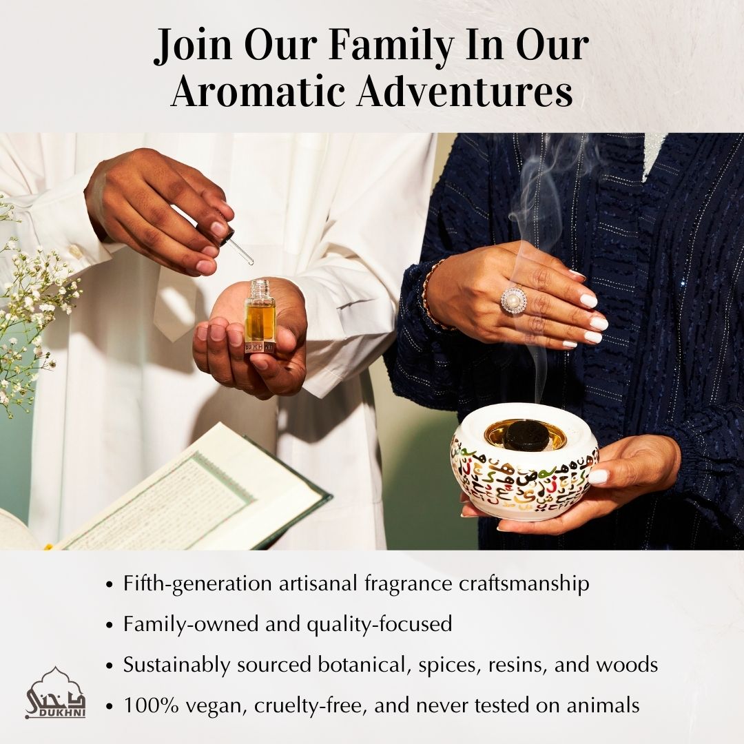 At Dukhni, every bakhoor blend is rooted in 100-year-old family recipes and crafted by seasoned perfumers. Our bakhoor is made using the purest, most premium natural ingredients, carefully sourced to ensure a luxurious, authentic scent experience.