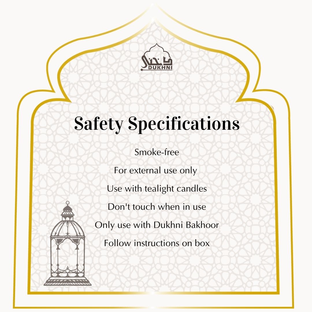 Burning: Do not burn the piece of bakhoor directly. Always use a Dukhni burner, electric burner or a charcoal burner.
