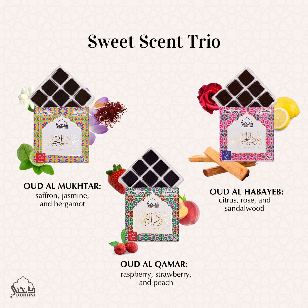 Uplift the mood of your home during special occasions with this premium bakhoor set. Includes 9 pieces each of three unique fragrances—Oud Al Teeb, Oud Al Raghbah, and Oud Al Awatef—plus 3 extra sample pieces. Crafted with premium oud and natural ingredients, this set fills your home with rich Islamic scents from Arabia, perfect for creating a relaxing, serene ambience during prayer, meditation, or gatherings.