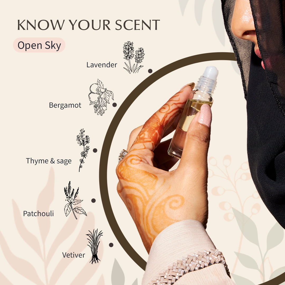 Open Sky Bakhoor is a premium roll-on attar oil made with pure, high-quality ingredients. This alcohol-free, vegan, and highly concentrated perfume oil offers elegant close-range diffusion and lasts up to 13–14 hours.