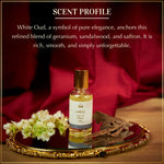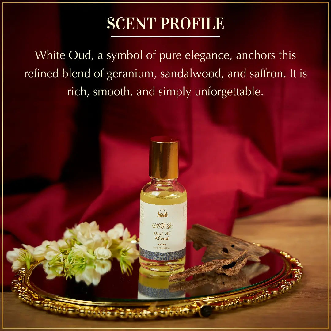A refined white oud aroma where velvety geranium meets warm sandalwood and a touch of saffron. These smooth, aromatic notes settle beautifully into a woody oud base, creating a timeless unisex scent that feels clean, elegant, and quietly captivating.