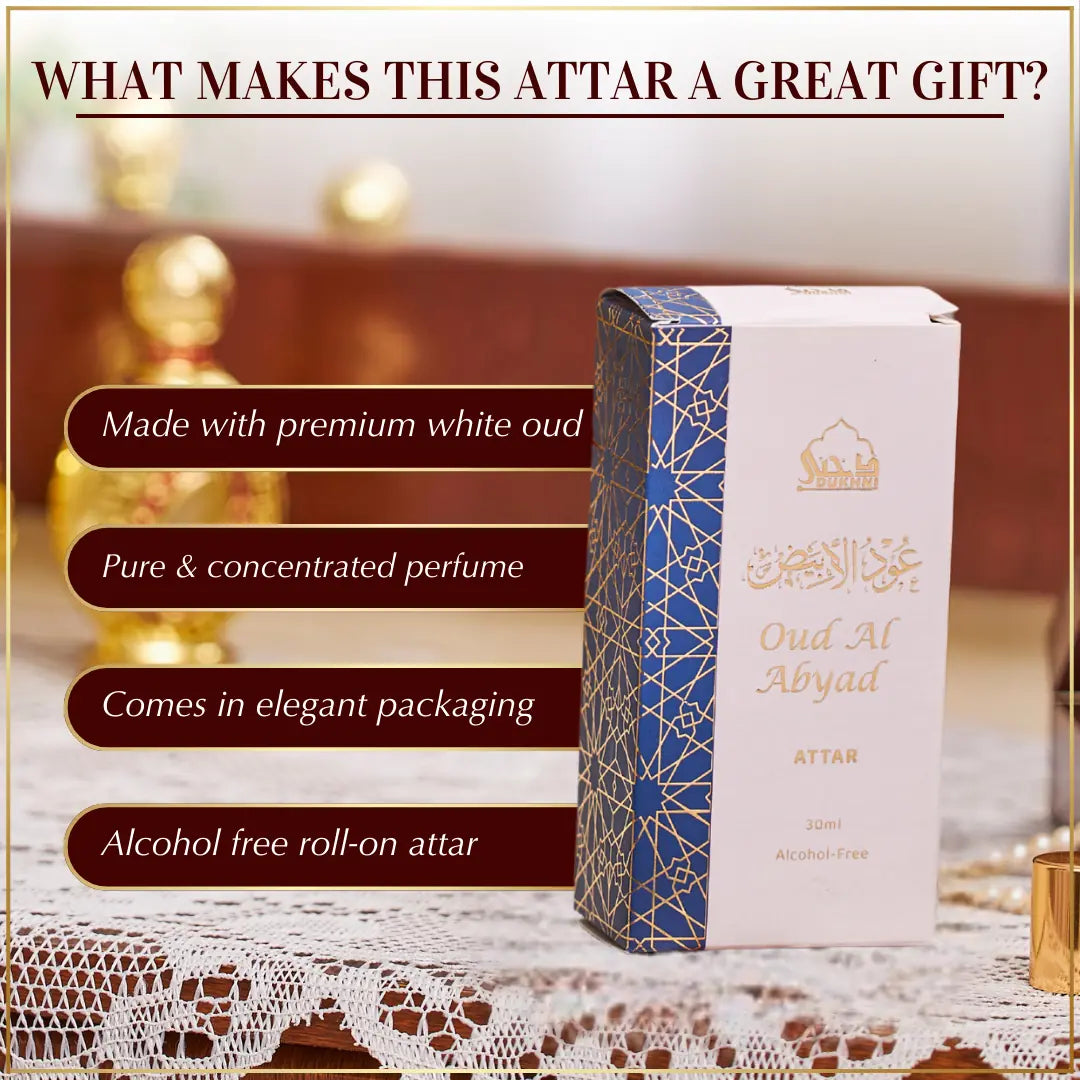 Love White Oud? Discover Dukhni’s 30ml Oud Al Abyad Attar—one of our new launches and best perfume oils. This concentrated roll-on is crafted with premium ingredients, completely alcohol-free, and delivers over 14 hours of lasting fragrance. Pure, potent, and made to impress, it’s perfect for daily wear, prayer, and gifting.
