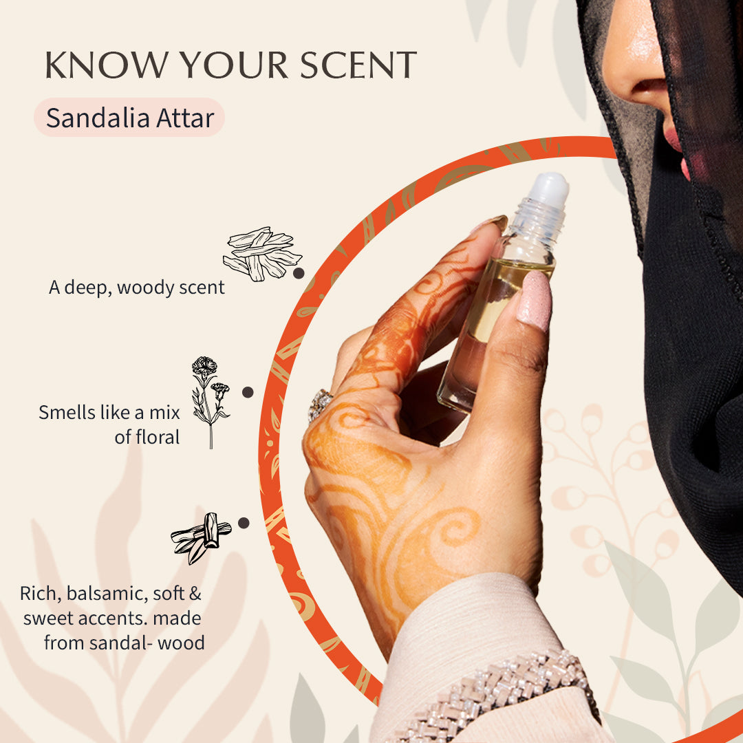 The Sandalia Attar has a soft, natural fragrance with a calming mix of sandalwood. It's long-lasting, not overpowering, and perfect for daily wear.
