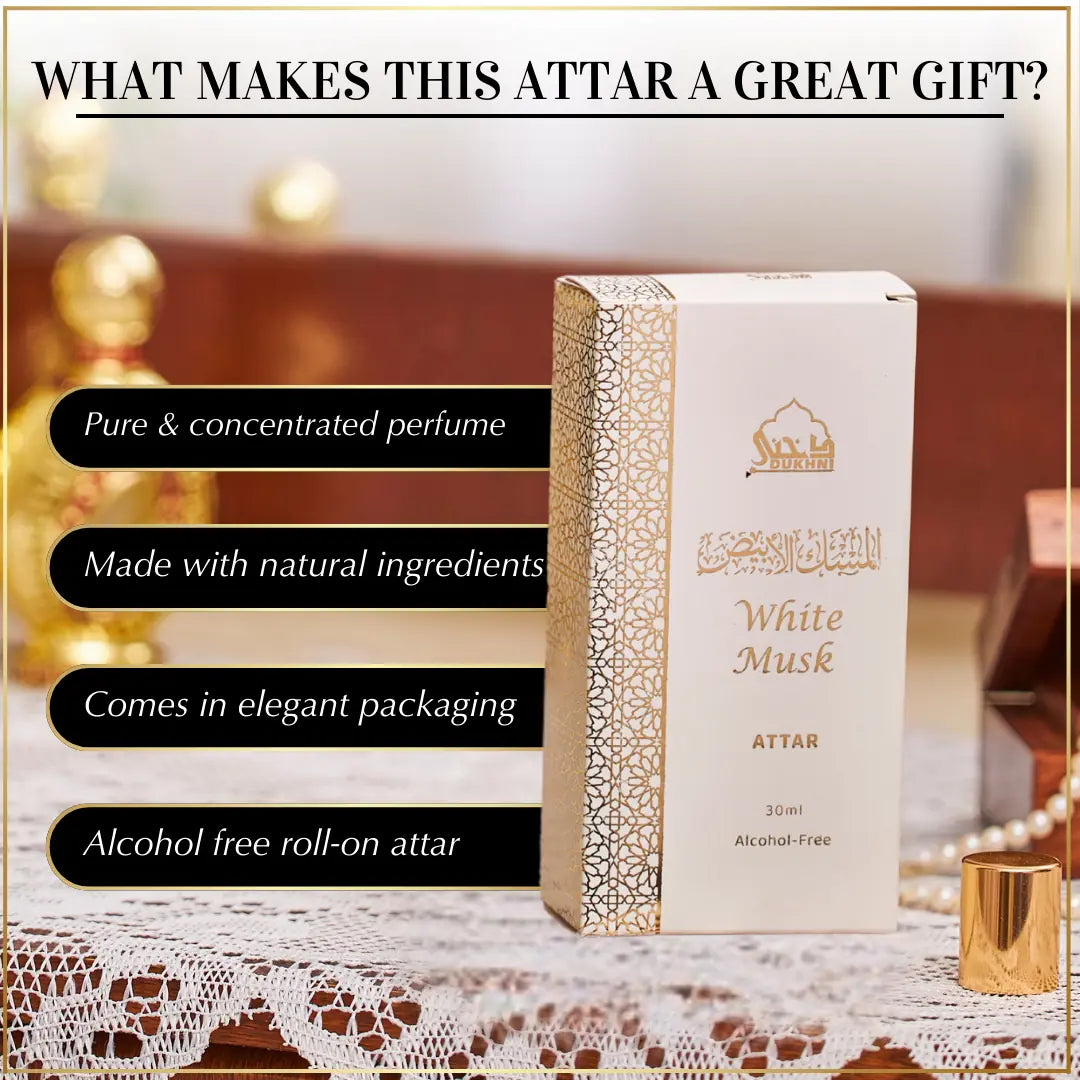 Experience all-day freshness with Dukhni’s 30ml White Musk Attar—a premium, alcohol-free perfume oil crafted for those who love clean, understated scents. Its smooth roll-on format makes it easy to wear anywhere, and the elegant packaging makes it a thoughtful, ready-to-gift choice.